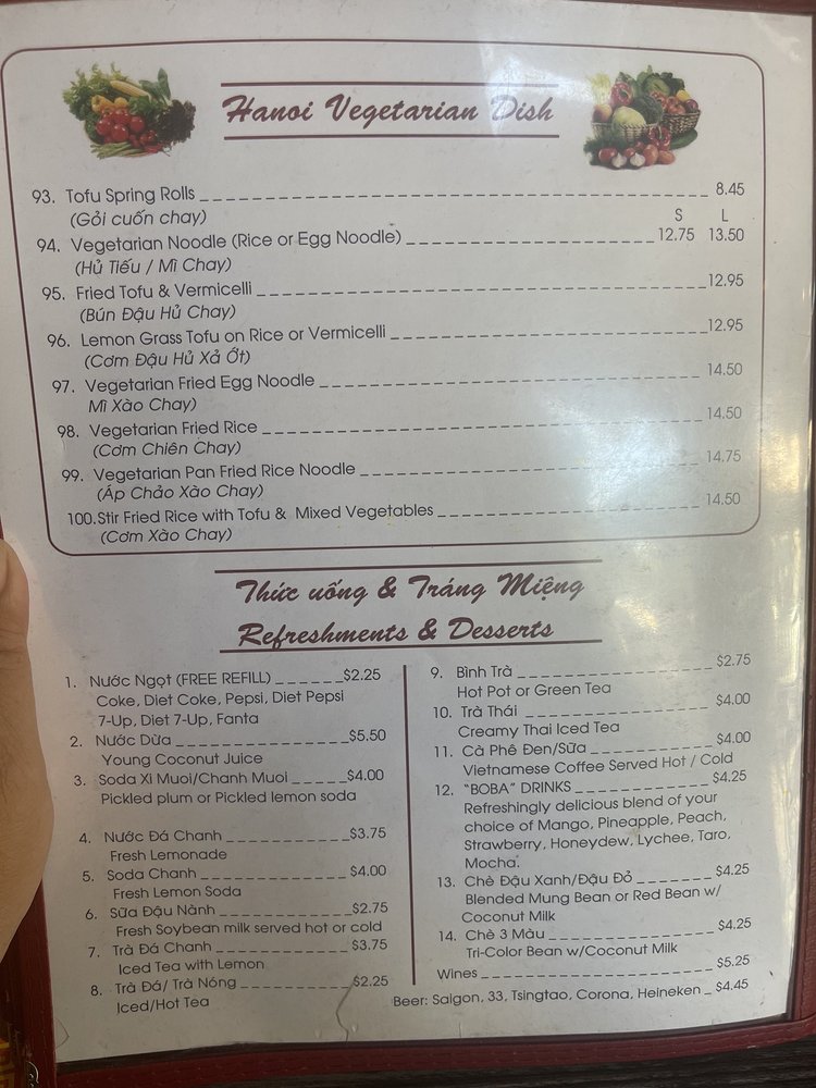 Pho Ha Noi, located in Irvine, CA, is a Vietnamese restaurant that offers a variety of options for both meat lovers and vegetarians. Their menu includes traditional dishes such as Banh Mi, Khai Vi, and of course, Pho. Customers rave about the flavorful broth and the generous servings of meat in their Pho dishes. Some popular choices include Pho Tai (rare steak), Pho Nam (well done brisket), and various combinations of meats and tendons. The restaurant also offers a selection of appetizers like Goi Cuon and Bo Nuong. With a casual ambiance and friendly service, Pho Ha Noi is a great spot for lunch or dinner with friends and family. If you are a fan of Vietnamese cuisine, this place is definitely worth a visit.
